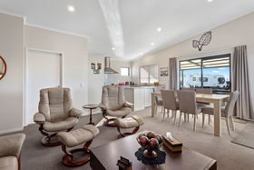 I am so excited to present this beautiful 2 bedroom modern home which looks straight down the road to the beach. The outdoor area, facing North, perfect for all seasons, covered and spacious to enjoy in any weather. Open plan living allows for everyone to be involved, the kitchen has all the modern appliances, plus a view from the kitchen window. For the cooler days you have double glazing and a heat pump. Internal access to the single garage which is lined and includes the laundry. What a lifestyle, no lawns to take care of, so what else do you do but enjoy the beach or grab the caravan and go touring.