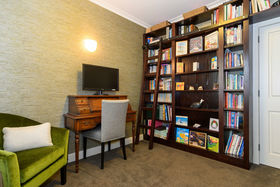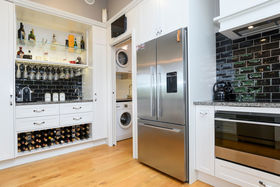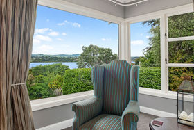 Three large bedrooms have retained their original charm with one currently used as an office with bespoke bookshelves carefully housing a tilt-away bed perfect for occasional guests. The family bathroom across the hall is generously sized and complete with a deep claw foot bath, extensive custom designed storage and adjacent chic powder room. At the end of the long hall, step up to the peaceful haven of the private master suite opening out to a private sheltered courtyard, soothed by the serenity of gently flowing water. A second lounge is warmed with a log gas fire keeping it snug and cosy and opening to a harbour facing deck with more water views.