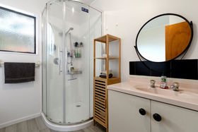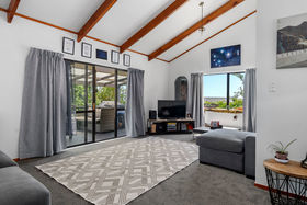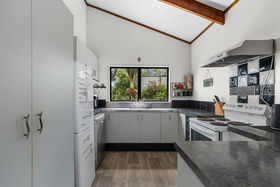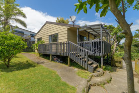 Upstairs, enjoy a light-filled three-bedroom, one-bathroom home featuring pitched ceilings that create a wonderful sense of space. The master bedroom opens directly to the deck, the perfect spot to unwind and soak in the green Welcome Bay outlook. A woodburner keeps the home warm and cosy through winter, and a separate laundry adds everyday practicality.