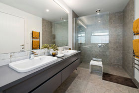 The master suite is generously proportioned, featuring a spacious ensuite with double vanities and a large dressing room with bespoke storage solutions. Gas underfloor heating ensures warmth and comfort throughout the lower level.
