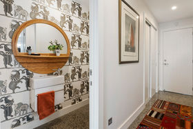 A separate lounge provides a more intimate retreat, complete with a gas fire and access to a sheltered patio. The designer kitchen is a standout feature, centred around a generous island finished with distinctive Banksy-style tiles. Filtered water is also supplied throughout the home for everyday convenience.
